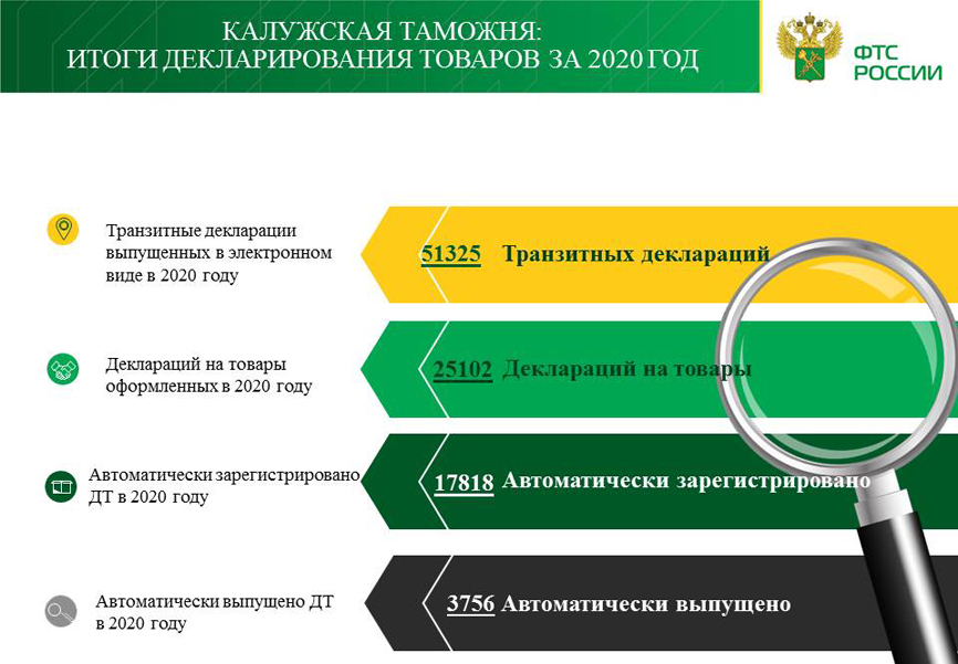 За 2020 Калужской таможней оформлено 25 102 деклараций на товары (далее – ДТ). Из них на экспортируемые товары подано 2759 ДТ, на импортируемые – 22 343 ДТ.