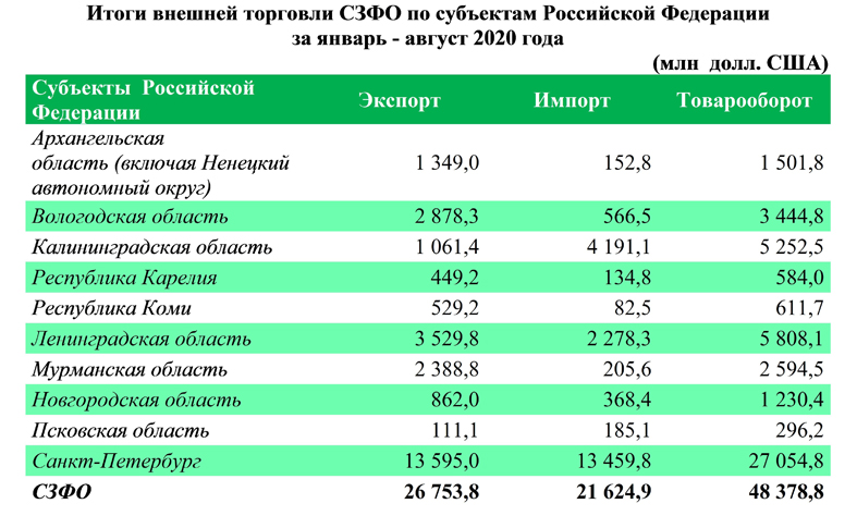 Внешнеторговый оборот составил 35,6 млрд долларов США, товарооборот - более 5,7 млн тонн. В товарной структуре экспорта преобладали металлы и изделия из них, машиностроительная продукция, продукция химической промышленности. В товарной структуре импорта - машиностроительная продукция, продукция химической промышленности, текстиль и текстильные изделия, продовольственные товары. В 2020 году на 10-15 % увеличился объемов декларирования оборудования и механических приспособлений, электрических машин, оптических приборов и аппаратов. Более чем на 20% увеличился объем декларирования изделий из черных металлов, продуктов неорганических химии, каучука и резиновых изделий. Лидерами по росту оформления стали товары 74 группы ТН ВЭД - медь и изделия из нее. На 10% сократилось оформление товаров 62 группы – предметов одежды и принадлежностей.