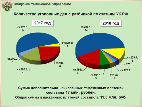 Значимым результатом стало пресечение противоправной деятельности организованного преступного сообщества, нанесшего колоссальный урон экономике Российской Федерации. На основании результатов оперативно-розыскных мероприятий, проведенных Сибирской оперативной таможней во взаимодействии с подразделениями ФСБ и МВД России, в сентябре 2018 года следственным комитетом РФ возбуждено уголовное дело по статье 210 УК РФ (организация преступного сообщества), а в декабре из материалов выделено еще одно дело по ч.4 ст.174.1 УК РФ, по факту легализации похищенных из бюджета денежных средств на общую сумму свыше 55 миллионов рублей.