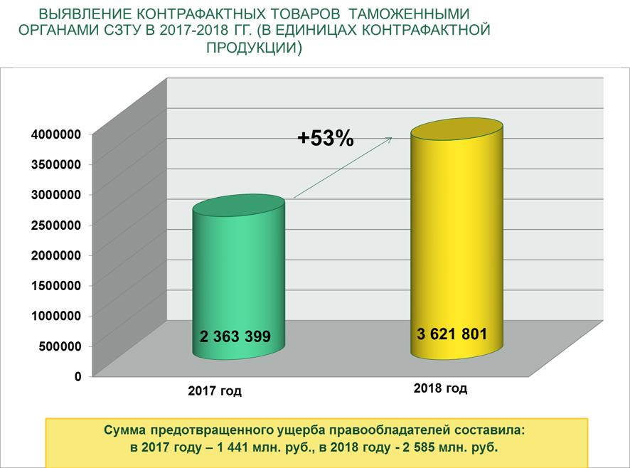 В рамках защиты прав интеллектуальной собственности в 2018 году выявлено и признано контрафактными 2,447 млн единиц продукции (в 2017 году – 1,44 млн ЕКП), предотвращен ущерб правообладателям на сумму более 391 млн руб.