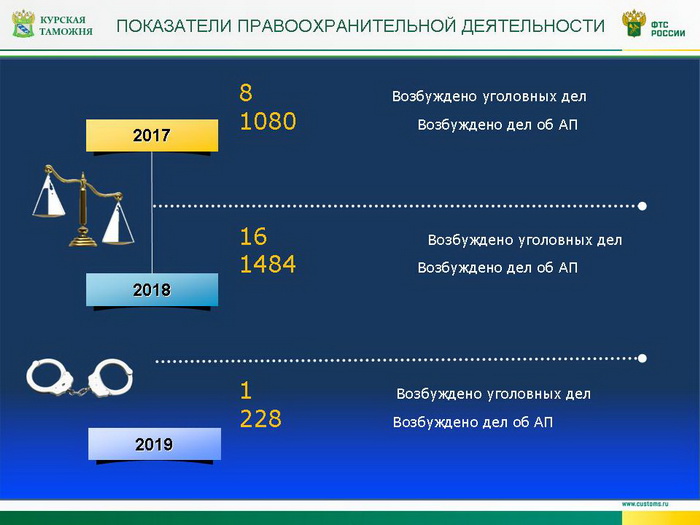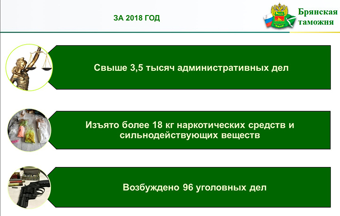В 2018 году органами предварительного следствия по уголовным делам, возбужденным таможенными органами региона, с обвинительным заключением в суды направлено 111 уголовных дел – почти вдвое больше, чем в 2017 году. Из них по 70 делам судами постановлены обвинительные приговоры. Больше половины направленных в суд уголовных дел были связаны с контрабандой наркотиков. В прошлом году за совершенные преступления было осуждено 58 человек. Ряд преступников приговорены к длительным срокам лишения свободы (свыше восьми лет лишения свободы).