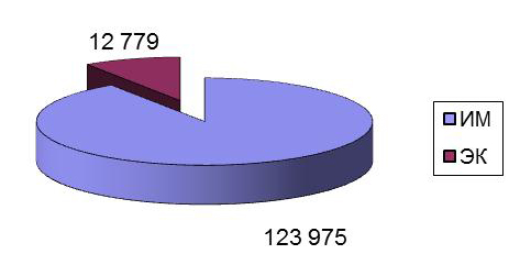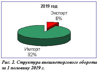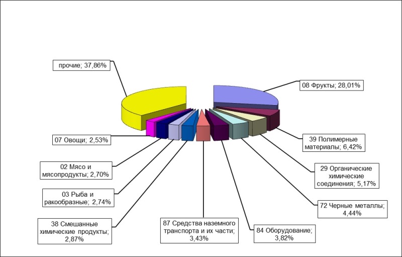 Диаграмма 2. Соотношение оформленных экспортных и импортных грузов в весовом выражении Весовой объем экспортных грузов увеличился на 19 %, импортных увеличился на 19 %. В товарной структуре импорта в весовом объеме лидирующие позиции занимали фрукты (28%), полимерные материалы (6.4%), органические химические соединения (5%), черные металлы (4.4%), оборудование (4%), средства наземного транспорта (3.4%), смешанные химические продукты (3%), рыба и ракообразные (3%), мясо и мясопродукты (3%), овощи (2,5%).