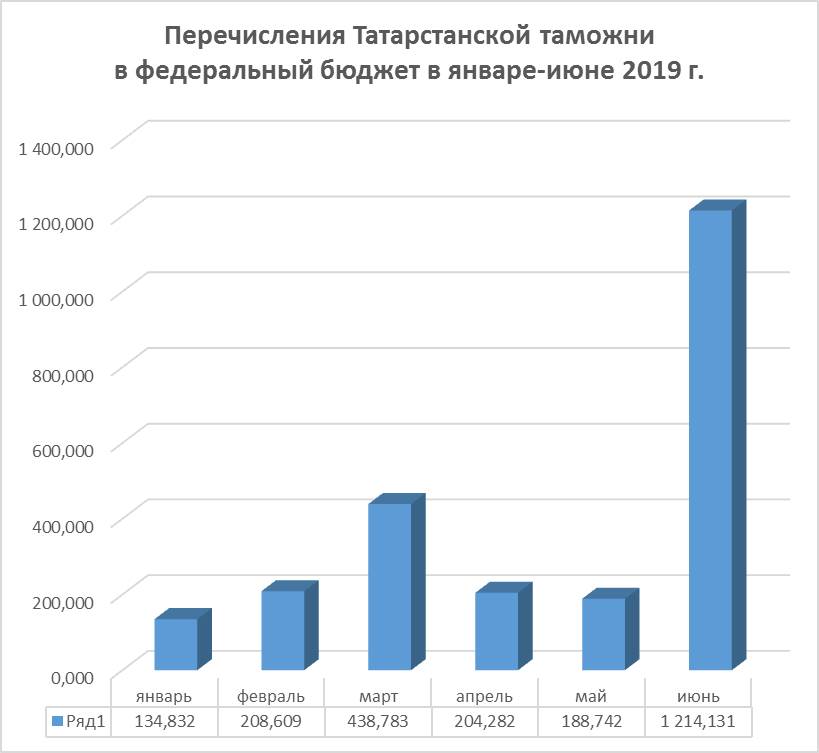 Более двух миллиардов рублей направила Татарстанская таможня в федеральный бюджет с начала годаС начала 2019 года Татарстанская таможня направила в федеральный бюджет 1 млрд 389 млн 379 тыс. руб. В июне татарстанские таможенники направили в доходную часть федерального бюджета 1 млрд 214 млн 131 тыс. руб. Из них платежи по импорту - 1 млрд 181 млн 393 тыс. руб., таможенные сборы – 5 млн 378 тыс. руб., утилизационные сборы – 26 млн 903 тыс. руб., штрафы – 441 тыс. руб., прочие неналоговые доходы – 17 тыс. руб.