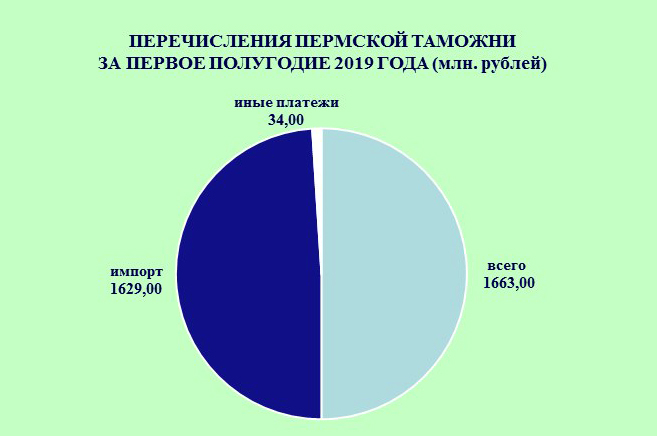 Пермская таможня: перечисления в государственный бюджетЗа первое полугодие 2019 года Пермская таможня перечислила в федеральный бюджет Российской Федерации 1 миллиард 663 миллиона рублей. Плановое задание по перечислению доходов в бюджет страны выполнено на 107 %. Долевое соотношение перечислений в текущем году аналогично показателям прошлого года: большую часть составляли поступления в бюджет от импортных операций – 1 миллиард 629 миллионов рублей.
