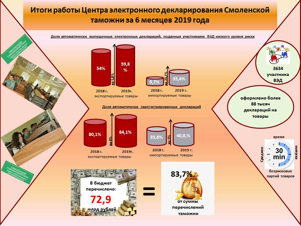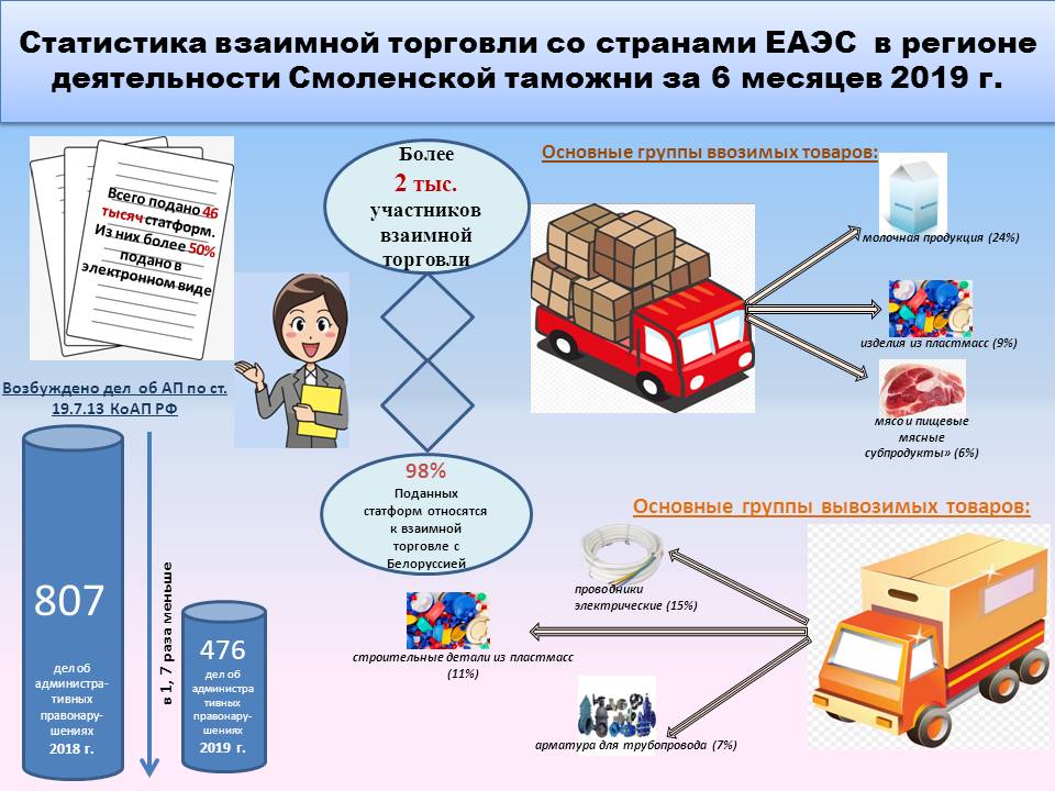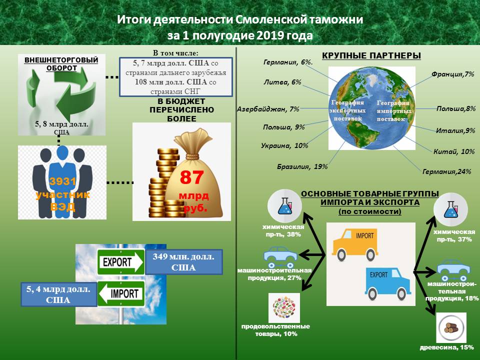 Смоленская таможня подвела итоги деятельности за первое полугодие - в бюджет перечислено более 87 миллиардов руб- По итогам работы за первое полугодие 2019 года Смоленская таможня пополнила государственную казну на 87 миллиардов 49 миллионов рублей, - сообщил исполняющий обязанности начальника таможни Владислав Лёгкий. - Рост по сравнению с аналогичным периодом 2018 года составил 18,9 % или 13,8 миллиардов рублей в абсолютных цифрах. Также он отметил, что в регионе деятельности Смоленской таможни за 6 месяцев 2019 года экспортно-импортные операции осуществляли 3931 участник внешнеэкономической деятельности, их количество по сравнению с 1 полугодием 2018 года увеличилось на 7,7 %. Таможенными постами оформлено более 100 тыс. деклараций на товары, что на 5,3 % превышает показатель прошлого года. Экспортные декларации составили 13,4%, прирост - 0,9%. Экспортировали товары 708 участников ВЭД, импортировали – 3579. Внешнеторговый оборот составил 5,8 млрд долл. США, в том числе со странами дальнего зарубежья – 5,7 млрд долл. США (98% от оборота в целом), странами СНГ – 108 млн долл. США (2%). Импортные поставки дали результат в 5,460 млрд долл. США, в том числе из стран дальнего зарубежья – 5,43 млрд долл. США (99,5% от импорта в целом), из стран СНГ – 27 млн долл. США (0,5%). Экспорт - 349 млн долл. США, в том числе в страны дальнего зарубежья – 268 млн долл. США (77% от экспорта в целом), страны СНГ – 81 млн долл. США (23%). Товарная структура экспорта и импорта не изменилась. Среди экспортных товаров наибольший удельный вес (по стоимости) приходился на продукцию химической промышленности (37%), машиностроительная продукция (18%), древесина и изделия из нее (15%). Среди основных товарных групп импорта можно отметить продукцию химической промышленности (38%), машиностроительную продукцию (27%), продовольственные товары (10%). За отчетный период товары экспортировались в 78 стран мира, импортировались из 147 государств. Превышение импорта над экспортом составило 5,11 млрд долл. США. Крупными партнерами, влияющими на объемы экспорта в целом, стали: Бразилия (19% в общем объеме экспорта), Украина (10%), Польша (9%), Азербайджан (7%), Литва (6%), Германия (6%). Наиболее крупные страны-экспортеры в общем объеме импорта: Германия (24%), Китай (10%), Италия (9%), Польша (8%), Франция (7%).