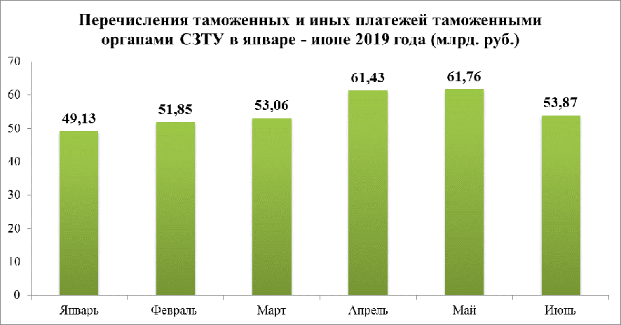 Информация об объемах взимания таможенными органами СЗТУ таможенных платежей в федеральный бюджет РФ в июне 2019 годаВ июне 2019 года таможенными органами Северо-Западного таможенного управления осуществлено взимание в федеральный бюджет Российской Федерации таможенных и иных платежей на сумму 53,87 млрд. рублей, в том числе в отношении импортируемых товаров – 53,15 млрд. рублей, экспортируемых товаров – 0,37 млрд. рублей. Основной объем взимания в федеральный бюджет таможенных платежей в Северо-Западном регионе приходится на Балтийскую (66,55%), Санкт-Петербургскую (17,40%), Кингисеппскую (4,55%) и Выборгскую (3,49%) таможни.