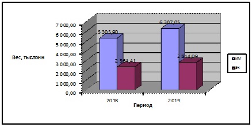 Диаграмма 1. Соотношение экспортных и импортных ДТ за январь - июнь2019 года Весовой объем оформленных грузов в январе - июне 2019 года по сравнению с аналогичным периодом прошлого года увеличился с 7 670.31 тыс. тонн до 6 121.14 тыс. тонн (на 19 %).