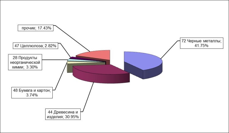 Диаграмма 3. Основные группы товаров, импортируемые в РФ в регионе деятельности Балтийской таможни за январь - июнь 2019 года В товарной структуре экспорта в весовом объеме преобладали: черные металлы (42 %),древесина и изделия из неё (31%), бумага и картон (4%), продукты неорганической химии (3,3%), целлюлоза (3%).
