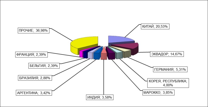 Диаграмма 4. Основные группы товаров, экспортируемые из РФ в регионе деятельности Балтийской таможни за январь - июнь 2019 года В январе-июне 2019 года товары импортировались из 143 стран мира. Основные страны-импортеры: Китай (20,5%), Эквадор (15%), Германия (5.3%), Республика Корея (4%), Марокко (4%), Индия (3,5%), Аргентина (3,4%), Бразилия (3%), Бельгия (2.4%), Франция (2,4%).