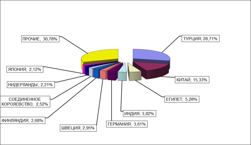 Диаграмма 5. Основные страны-поставщики товаров, импортируемых в РФ в регионе деятельности Балтийской таможни за январь-июнь 2019 года Экспорт товаров осуществлялся в 139 стран мира. Основными странами-экспортерами являлись Турция (29%), Китай (15.3%), Египет (5,3%), Индия (3,8%), Германия (3,6%), Швеция (3%), Финляндия (3%), Соединенное королевство (2,5%), Нидерланды (2,2%), Япония (2%).