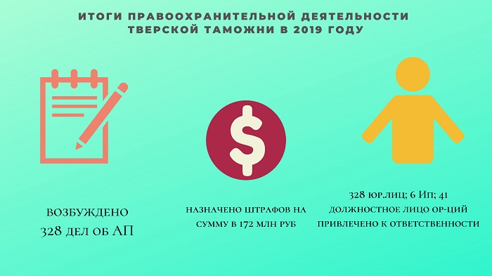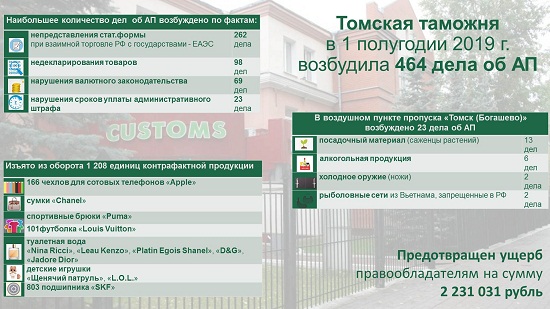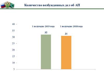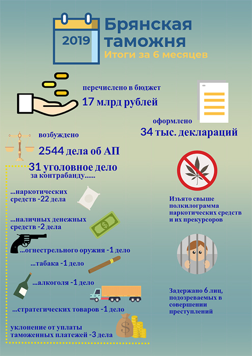 По итогам правоохранительной деятельности в 1 полугодии 2019 года возбуждено 873 дела об административных правонарушениях, что на 34,1% больше по сравнению с аналогичным периодом прошлого года (651 дел об АП). Общая сумма взысканных административных штрафов составила более 900 тыс. рублей. Возбуждено 4 уголовных дела, три из которых – по фактам уклонения от уплаты таможенных платежей. Сумма уклонения от уплаты таможенных платежей составила более 7 млн рублей.