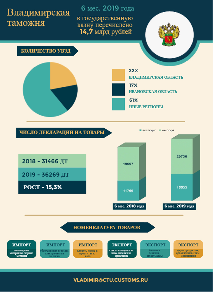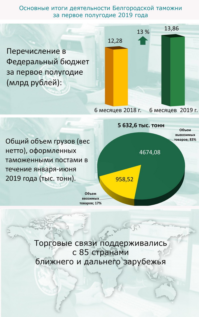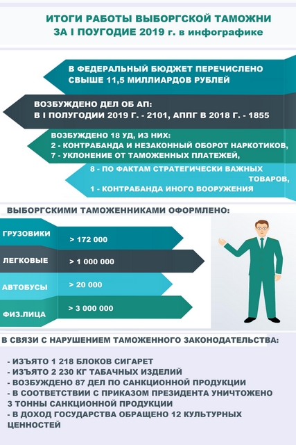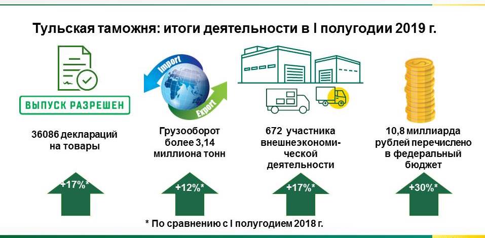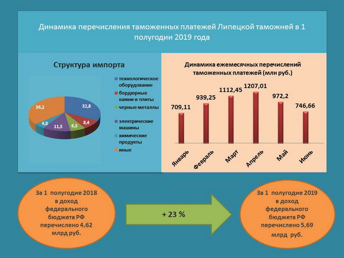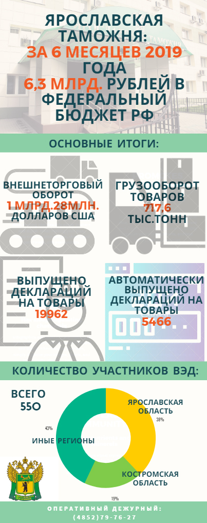 6,8 миллиарда рублей перечислила в бюджет государства Хабаровская таможня в первой половине 2019 года6,8 миллиарда рублей перечислила в бюджет государства Хабаровская таможня за январь – июнь 2019 года. Это более чем на 1,6 миллиарда больше, чем за первые 6 месяцев 2018 года. В состав таможенных платежей вошли ввозная и вывозная таможенные пошлины, НДС, акциз, таможенный и утилизационные сборы, штрафы и иные таможенные платежи. 1,9 миллиарда рублей составила таможенная пошлина за экспорт товаров. В первом полугодии 2019 года основными товарами экспорта стали древесина и металлы, а также изделия из них, продовольственные товары и сельскохозяйственное сырье. Крупнейшие торговые партнеры в экспортных операциях 2019 года – Китай, Филиппины, Республика Корея, Япония, Германия, США, Тайвань и Малайзия. Ввозная таможенная пошлина составила 568,3 миллиона рублей. Среди основных товаров импорта продукция химической промышленности, металлы и изделия из них, машины, оборудование, продовольственные товары и сельскохозяйственное сырье. Торговыми партнерами в импортных операциях стали Китай, Австралия, Германия, США, Республика Корея, Эстония, Франция и Соединенное Королевство. 793 участника внешнеэкономической деятельности осуществляли экспортно-импортные операции в регионе деятельности Хабаровской таможни в первом полугодии 2019 года, что на 85,7 % больше, чем за аналогичный период 2018 года. Число оформленных деклараций на товары, увеличилось на 33%. Рост предпринимательской активности обусловлен проведением Федеральной таможенной службой эксперимента по концентрации таможенного декларирования: все товары, перемещаемые на Дальнем Востоке авиатранспортом, декларируются в Приамурском таможенном посту (Центре электронного декларирования) Хабаровской таможни. По сравнению с аналогичным периодом прошлого года наблюдается снижение грузооборота по экспорту на 20,2 % и рост по импорту на 23,1 %. Внешнеторговый оборот по экспорту снизился на 46,4 %, по импорту вырос на 19,8 %. 5,5 миллиона рублей из перечисленных в федеральный бюджет таможенных платежей составили штрафы, назначенные судом по выявленным Хабаровской таможней нарушениям таможенного законодательства. Пресс-служба ДВТУ 08.07.19