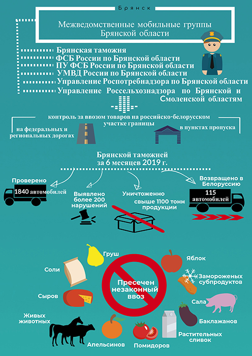 Санкционный уловЗа I полугодие 2019 года подразделениями таможенного контроля после выпуска товаров Центрального таможенного управления было проверено 9677 транспортных средств, перевозивших товар общим весом 148 498,5 тонн. Нарушения выявлены у 567 перевозчиков. Основной ассортимент незаконно ввезенных товаров – плодоовощная продукция (яблоки, томаты, гранаты, груши и т.д.). Как правило, эти товары следуют из Польши, Молдовы, Украины через территорию Беларуси. По результатам контроля соблюдения запретов и ограничений, установленных законодательством Российской Федерации, возвращено на территорию Республики Беларусь товаров общим весом 3774,8 тонн, уничтожено 3199 тонн. Задержано и проводится проверка в отношении 1093 тонн продукции. По фактам незаконного ввоза товаров таможенными органами возбуждено 371 дело об административных правонарушениях, 2 уголовных дела по фактам использования поддельных документов на транспортные средства возбуждено органами внутренних дел по материалам, переданным таможенными органами. Таких результатов удалось достигнуть благодаря эффективному внутриведомственному взаимодействию подразделений таможенного контроля после выпуска товаров, правоохранительных подразделений таможенных органов, а также межведомственному взаимодействию таможенных органов с территориальными подразделениями Пограничной службы ФСБ России, УМВД России в субъектах Российской Федерации, Россельхознадзора Пресс-служба ЦТУ 10.07.19