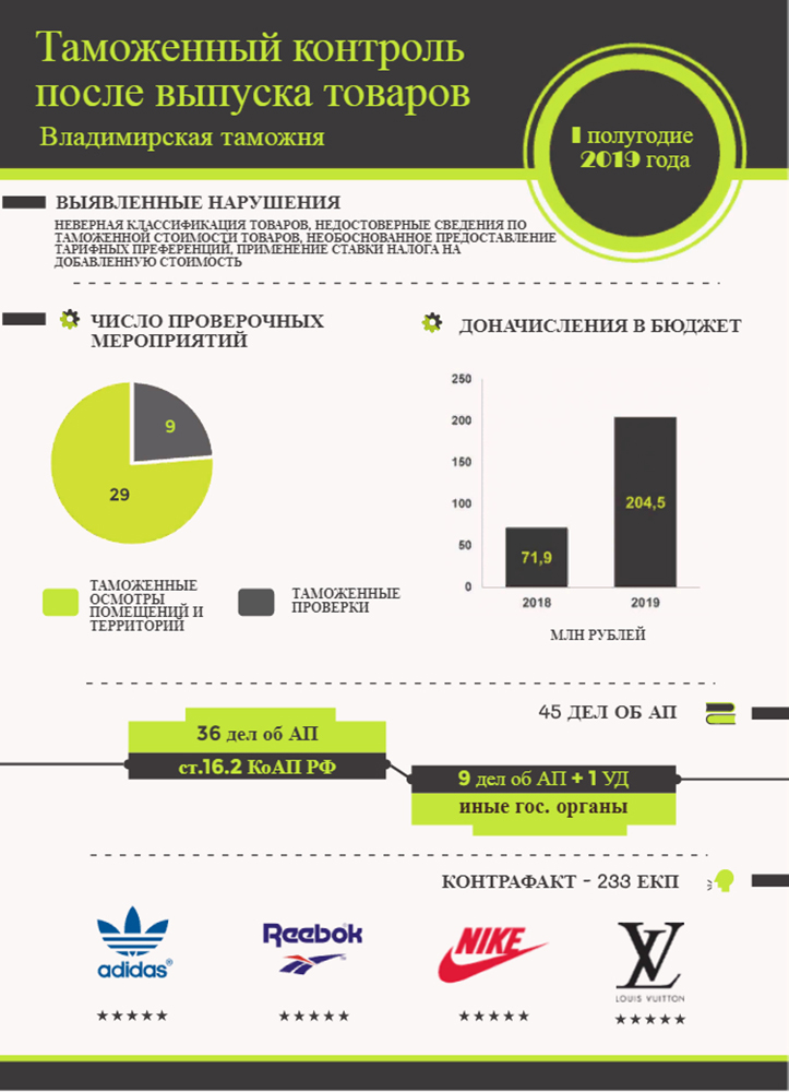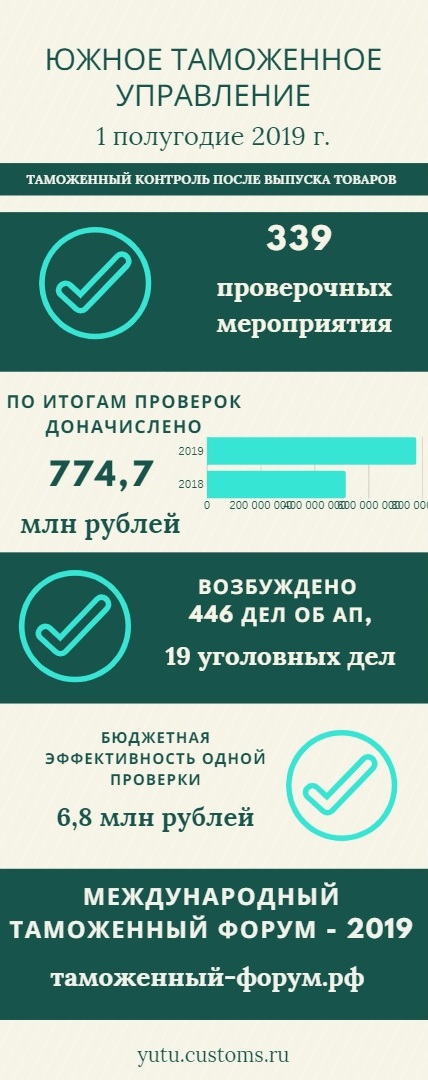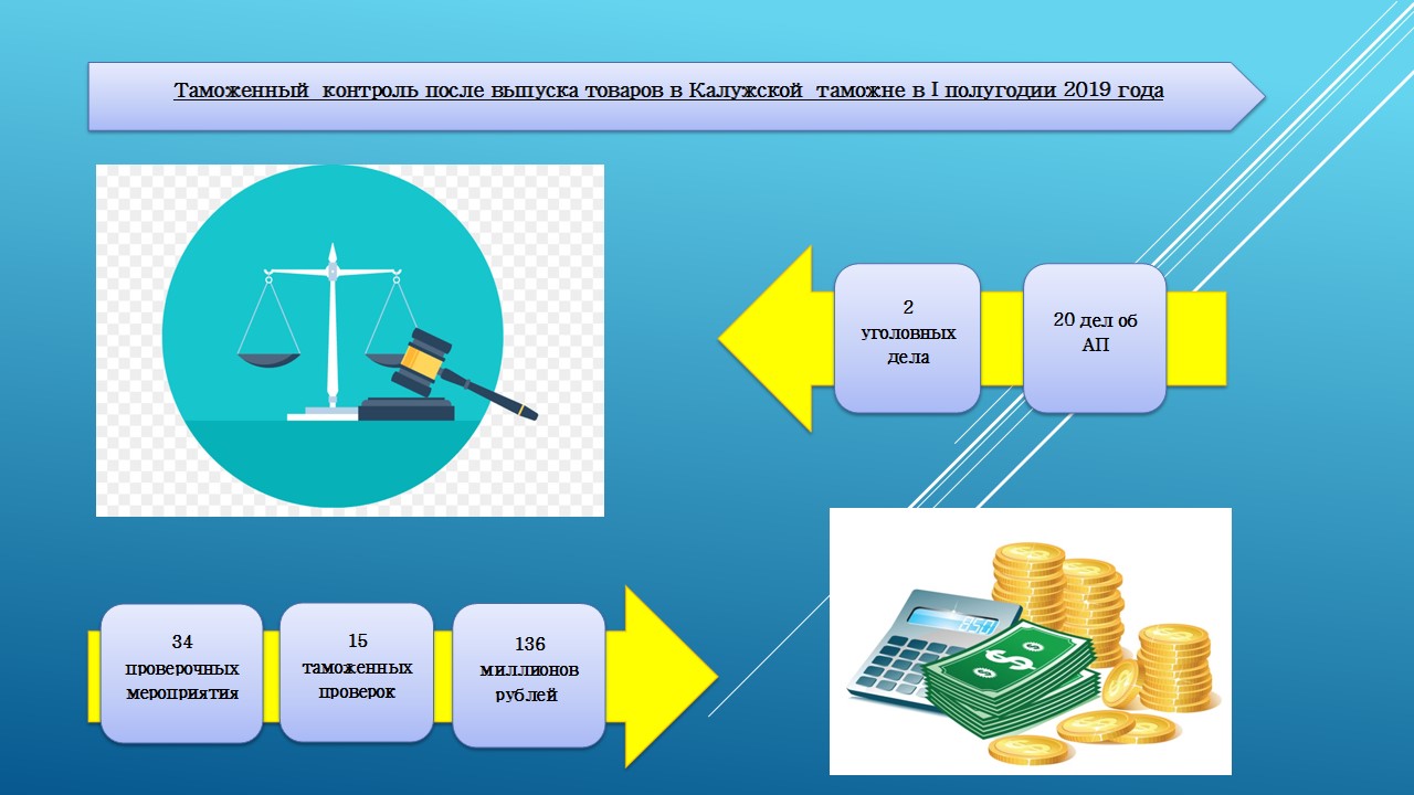 REGNUM. 34 проверочных мероприятия было проведено за шесть месяцев 2019 года калужскими таможенниками уже после выпуска товаров. По итогам этих проверок дополнительно начислено в казну более 136 миллионов рублей. Также возбуждено два уголовных дела и 20 дел об административных правонарушений