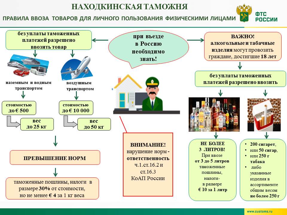 ФТС России информирует: снимаются ограничения по вывозу из ЕАЭС алкоголя и табака физлицами для личного пользованияС 30 июня 2019 года снимаются ограничения по вывозу с таможенной территории ЕАЭС физическими лицами для личного пользования этилового спирта, алкогольных напитков, пива, а также табака и табачных изделий. Ранее такие ограничения распространялись как на ввоз, так и на вывоз указанных товаров. Решением Совета Евразийской экономической комиссии ограничения по перемещению достигшим 18-летнего возраста лицом этилового спирта, алкогольных напитков и пива (общим объемом не более 5 литров), а также табака и табачных изделий (в количестве не более 200 сигарет, или 50 сигар (сигарилл), или 250 г табака, или общим весом не более 250 г) будут распространяться только на ввоз такой продукции. ФТС России обращает внимание физических лиц: без уплаты пошлин, налогов разрешен ввоз в ЕАЭС алкоголя объемом до 3 литров в расчете на одно физическое лицо, достигшее 18-летнего возраста. Таким образом, при ввозе алкоголя общим объемом свыше 3 литров, но не более 5 литров необходимо произвести декларирование ввозимого сверх беспошлинной нормы товара и уплатить пошлины, налоги. При вывозе алкоголя и табака из ЕАЭС следует учитывать, что нормы ввоза данной продукции физлицами для личного пользования в третьи страны регулируются законодательством данных стран. Пресс-служба ФТС | |||||||||||||||||||||||||||||||||||||||||||||||||||||||||||||||||||||||||||||||||||||||||||||||||||||||||||||||||||||||||||||||||||||||||||||||||||||||||||||||||||||||||||||||||||||||||||||||||||||||||||||||||||||||||||||||||||||||||||||||||||||||||||||||||||||||||||||||||||