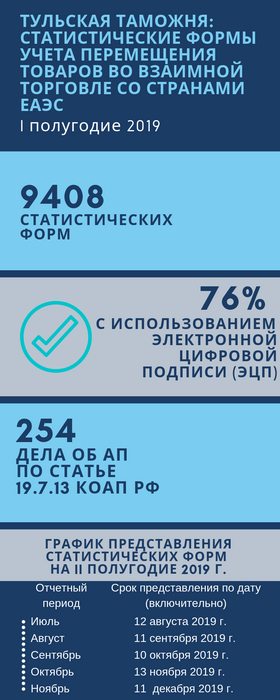 Пермская таможня о сроках и порядке подачи статистических форм учета перемещения товаровПермская таможня напоминает о необходимости направить статистическую форму учета перемещения товаров (далее – «статформа») в срок до 10 июля 2019 года. «Статформа» заполняется и подается в таможенные органы Российской Федерации на товары, перемещаемые между Российской Федерацией и Республиками Беларусь, Казахстан, Армения, Кыргызской Республикой. Заполняется «статформа» с использованием программного обеспечения, размещенного на официальном сайте ФТС России в сети Интернет (www.customs.ru) через личный кабинет в соответствии с Правилами, установленными постановлением Правительства Российской Федерации от 7 декабря 2015 г. № 1329 «Об организации ведения статистики взаимной торговли Российской Федерации с государствами – членами Евразийского экономического союза». В настоящее время статистические формы учета перемещения товаров предоставляются либо в электронном виде с использованием усиленной квалифицированной электронной подписи (ЭЦП), либо на бумажном носителе. Пермская таможня информирует о том, что на рассмотрении в Правительстве Российской Федерации находится проект постановления, утверждающий Правила ведения статистики взаимной торговли России с государствами – членами Евразийского экономического союза, в соответствии с которым предусмотрено, что «статформы» будут подготавливаться и представляться только с использованием ЭЦП. Важно! В связи с этим, участникам ВЭД, представляющим «статформы» в таможню на бумаге необходимо проверить имеющуюся ЭЦП на сайте, а при ее отсутствии или в случае, если ЭЦП не прошла проверку, заблаговременно позаботиться о ее получении. Ознакомиться с подробной информацией о правилах и сроках подачи статистической формы учета перемещения товаров можно на сайте ФТС России, пройдя по ссылке: https://edata.customs.ru/FtsPersonalCabinetWeb/services/about/stat . Пермская таможня напоминает, что согласно статье 19.7.13 Кодекса Российской Федерации об административных правонарушениях, штрафные санкции за нарушение правил и сроков подачи статистической формы в таможенные органы составляют: