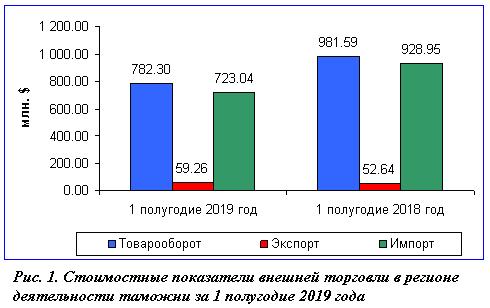 Внешнеторговый оборот в регионе деятельности Сочинской таможни увеличился на 37,6% до 30,69 млн долл. США (в 1 полугодии 2018 года - 22,3 млн долл. США). Стоимостные объемы экспорта увеличились на 9,6% с 15,23 млн долл. до 16,68 млн долл. Стоимость импортных поставок выросла в 2 раза с 7,08 млн долл. до 14,01 млн долл.