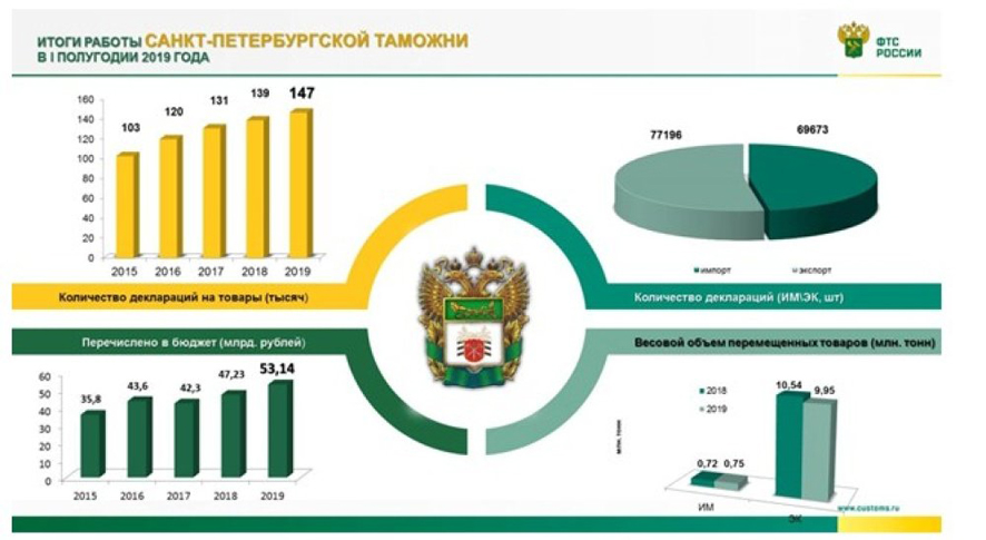 Итоги внешней торговли в регионе деятельности Балтийской таможни за январь-июнь 2019 годаВ регионе деятельности Балтийской таможни осуществляют свою деятельность 7 948 участников ВЭД. Внешнеторговый оборот в регионе деятельности Балтийской таможни за январь - июнь 2019 года составил 18995.25 млн. долларов США. За январь - июнь 2019 года Балтийской таможней оформлено 146 432 деклараций на товары (далее – ДТ) (по импорту 149 041 ДТ, по экспорту 15 385 ДТ).