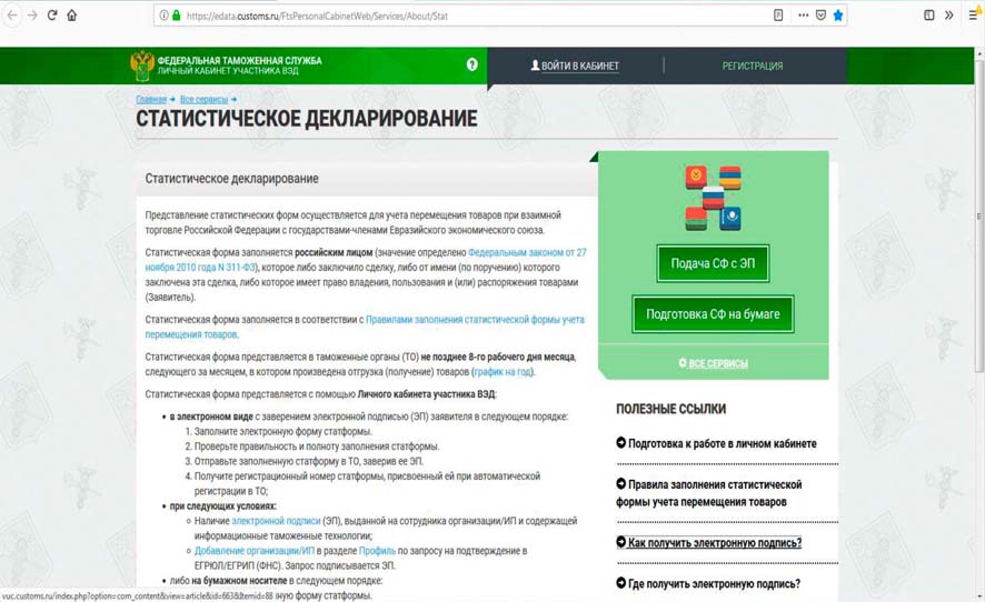 Для сведения лиц, осуществляющих взаимную торговлю с республиками Беларусь, Казахстан, Армения и Кыргызской РеспубликойС 27 января 2019 года вступило в силу Решение Коллегии Евразийской экономической комиссии от 25.12.2018 № 210 "Об утверждении Методологии ведения статистики взаимной торговли товарами государств - членов Евразийского экономического союза и Методологии ведения таможенной статистики внешней торговли товарами государств - членов Евразийского экономического союза" Утвержденная методология ведения статистики взаимной торговли товарами государств - членов ЕАЭС (далее – методология) может оказать помощь юридическим лицам и индивидуальным предпринимателям в понимании того, при перемещении каких товаров наступает обязанность подачи в таможенные органы статистических форм учета перемещения товаров (далее – статистических форм). В частности, в методологии приведены: - отдельные категории товаров, определение наличия или отсутствия необходимости учета которых может вызывать затруднения; - понятие стоимостной оценки товаров, их количественного учета; - определение момента учета товаров. Решение Коллегии Евразийской экономической комиссии от 25.12.2018 № 210 размещено на официальном сайте ЕАЭС http://www.eaeunion.org. Статистическая форма заполняется зарегистрированным пользователем через вкладку «Личный кабинет участника ВЭД» на официальном интернет-сайте ФТС России (www.customs.ru). На официальном интернет-сайте ФТС России по адресу: http://edata.customs.ru размещены подробные инструкции для участников ВЭД о порядке заполнения и отправки статистических форм, в том числе о преимуществах применения электронной подписи. Пресс-служба ЦТУ 02.07.19