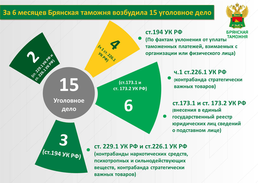 9 из них возбуждено ст. 194 УК РФ «Уклонение от уплаты таможенных платежей, взимаемых с организации или физического лица». Общий размер уклонения от уплаты таможенных платежей составил 23,2 млн руб.