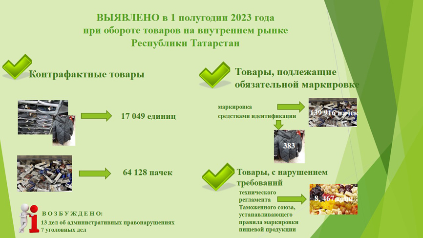 По данным материалам возбуждено 3 дела об административных правонарушениях по статьям 14.43 КоАП РФ (нарушение изготовителем, продавцом требований технических регламентов), 3 дела по 14.10 КоАП РФ (незаконное использование чужого товарного знака), 1 уголовное дело по ст. 180 УК РФ (незаконное использование средств индивидуализации товаров).