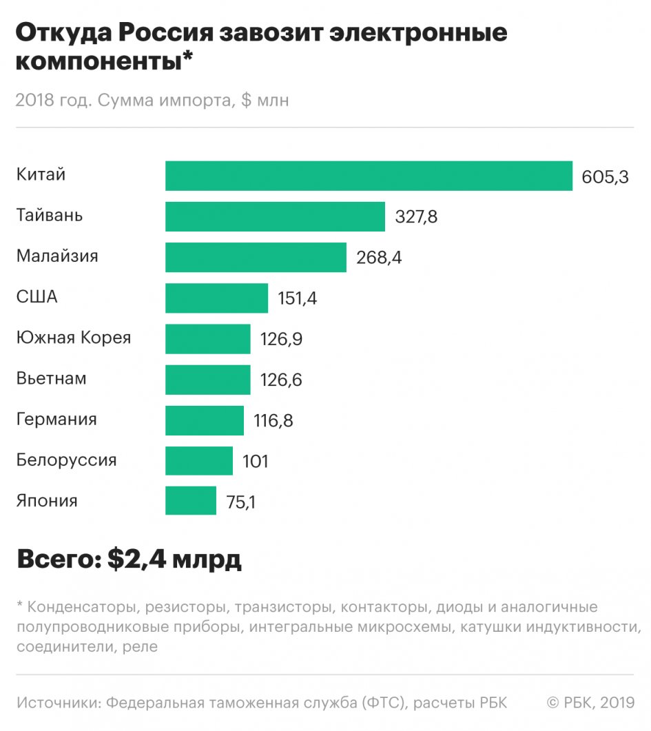 В январе-апреле 2019 года объем российского экспорта интегральных электросхем вырос на 10% по сравнению с аналогичным периодом 2018 года и составил 15,2 млн долларов.