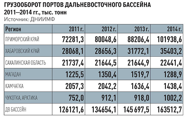 Грузооборот портов макрорегиона, по данным Дальневосточного института морского флота (ДНИИМФ), в 2014 году увеличился на 12,2 процента по отношению к 2013-му и составил 163,5 миллиона тонн. Это касается практически всей номенклатуры, кроме строительных грузов и ряда других позиций: например, импорт грузовых машин, по данным таможенного управления, сократился в 1,8 раза, автобусов - в 1,7.