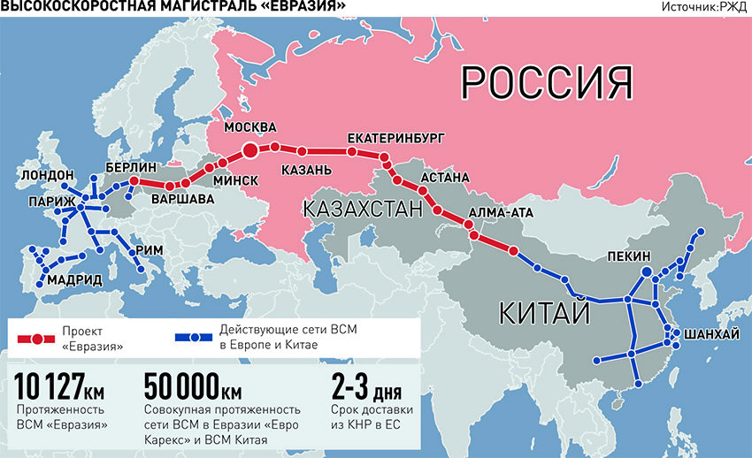 Еще одним ответом на вызовы времени, по словам главы ОАО "РЖД", является международный проект высокоскоростного грузопассажирского железнодорожного коридора "Евразия". "ВСМ "Евразия" должна объединить систему "Евро Карекс" и китайскую сеть ВСМ, и тогда мы сможем создать абсолютно новую высокоскоростную модель движения на евразиатском континенте", – заключил Олег Белозёров.