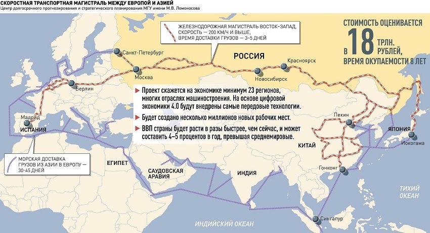 Президенту РФ направили очередную версию мегапроекта развития трансъевразийского транзита — на сей раз за авторством президента РАН Александра Сергеева и ректора МГУ Виктора Садовничего. Основы проекта прежние — высокоскоростные поезда, дирижабли, быстровозводимые взлетные полосы, а также развитие Севморпути. Если в 2016 году проект оценивался в $220–240 млрд, то сейчас уже в $310–320 млрд, но ученые обещают выйти на окупаемость за 12–15 лет. Аналитики считают документ малограмотным, а его основные постулаты крайне спорными.