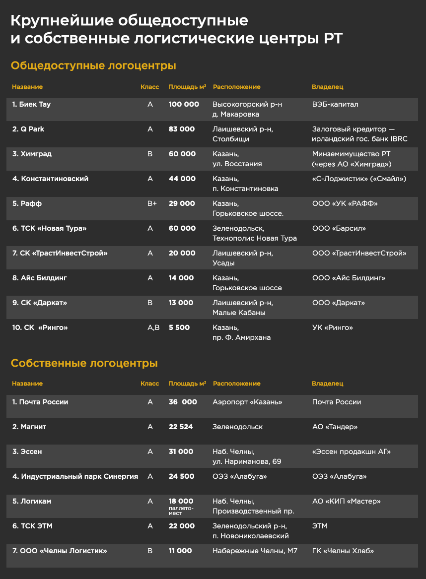 В наш рейтинг вошел топ-10 крупнейших по площади общедоступных складов Татарстана, которые специалисты отрасли называют спекулятивными (в них места предоставляются любому, кто предложит лучшую цену), а также 7 самых больших собственных складских комплексов крупных компаний — прежде всего торговых и логистических.