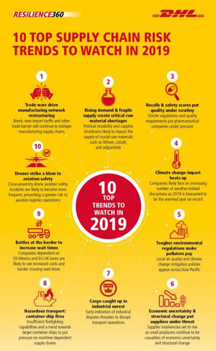 DHL опубликовал исследование, посвященное выявлению и анализу рисков сбоев в цепочке поставок. В исследовании обозначены 7 основных рисков, с которыми сталкивалась транспортно-логистическая отрасль в 2018 году – и 10, которые прогнозируются в 2019.