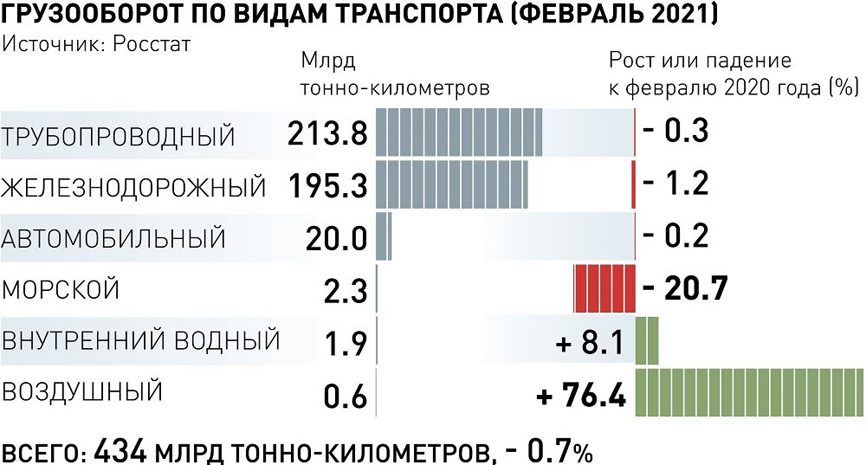 Данные российского грузооборота подтверждают сложную ситуацию с морскими перевозками. По данным Росстата, объемы доставки товаров морем в феврале 2021 года упали на 20,7% в сравнении с февралем прошлого года. Можно было бы сослаться на сложный год. Но ни один вид транспорта не потерял таких объемов, а грузоперевозки авиацией даже прибавили 76,4%.