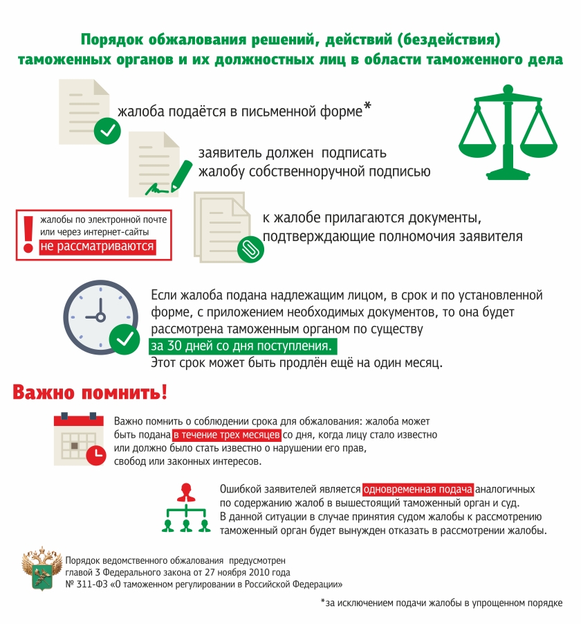Важно помнить и о соблюдении срока для обжалования: жалоба может быть подана в течение трех месяцев со дня, когда лицу стало известно или должно было стать известно о нарушении его прав, свобод или законных интересов. Однако в случае пропуска по уважительным причинам срока для обжалования он может быть восстановлен по заявлению лица, обратившегося с жалобой. Решение о том, является ли причина уважительной и следует ли восстановить срок в конкретной ситуации, принимает таможенный орган, уполномоченный рассматривать жалобу.