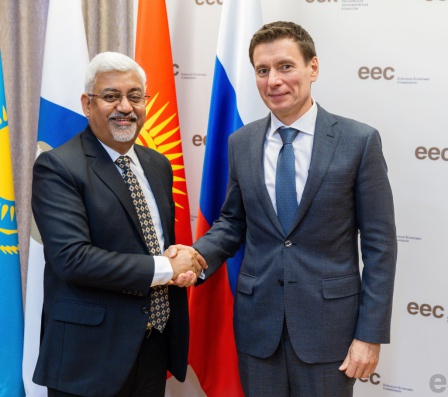 25 июля в штаб-квартире Евразийской экономической комиссии состоялась встреча между министром по торговле ЕЭК Андреем Слепневым и заместителем министра торговли и промышленности Индии Сунилом Бартвалом, находящимся в Москве в рамках участия индийской делегации в 14-й встрече министров торговли стран БРИКС и 36-й встрече контактной группы БРИКС по экономическим и торговым вопросам. Было отмечено, что страны Евразийского экономического союза и Индия обладают высоким потенциалом в сфере взаимной торговли, реализация которого должна помочь диверсифицировать структуру товарооборота и расширить сотрудничество в различных секторах экономики.