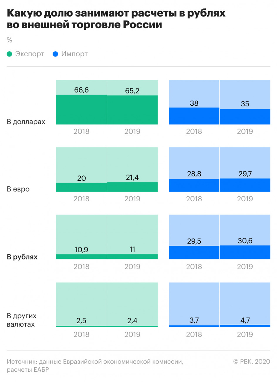 • Доля рубля в торговых расчетах в Евразийском союзе снизилась как по экспорту России — с 73,6% в 2018-м до 72,9% в 2019 году, так и по импорту — с 83,9 до 81%.